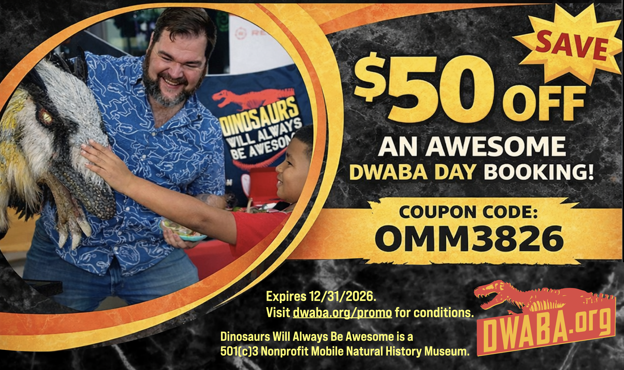$50 off valid on new Awesome DWABA Day bookings only. Minimum package required. Must book by August 31, 2026. Redeem online or by phone using promo code OMM3826 at time of booking. Limit one (1) coupon per customer. Not valid with any other offers, discounts, or promotions. No cash value. Non-transferable. Void if altered or duplicated. Subject to availability. © Dinosaurs Will Always Be Awesome. All rights reserved.
